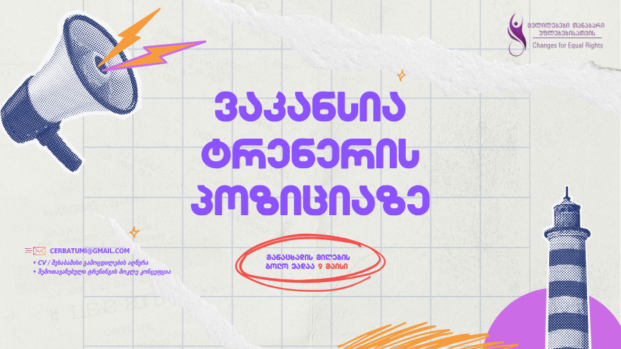 ახალგაზრდული ორგანიზაცია ცვლილებები თანაბარი უფლებებისათვის აცხადებს ტრენერების მიღებას შემდეგ თემებზე ტრენინგების ჩასატარებლად: 🔹 ადვოკატირება 🔹 ლობირება 🔹 მონიტორინგი 🔹 ქსელური თანამშრომლობა 📍 ტრენინგების ჩატარების ადგილი: აჭარა, გურია, სამეგრელო, იმერეთი. 👤 ვის ვეძებთ? ვეძებთ კვალიფიციურ და გამოცდილ ტრენერებს, რომლებიც ფლობენ: ✔️ შესაბამის სფეროში მუშაობის პრაქტიკულ გამოცდილებას ✔️ ტრენინგების ჩატარების დადასტურებულ გამოცდილებას ✔️ ინტერაქტიული სწავლების მეთოდების გამოყენების […]